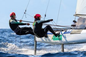 A solid start in the only Nacra 17 race today led to a clear win for Gimson and Burnet of Great Britain, a result even more impressive considering the pair had not trained since August’s world championships. A knee injury for Burnet, attention to sponsors and fitting out a new boat conspired to keep them off the water, but the pair already has their ticket to the Paris Games and will be full-on through the big event in Marseille.