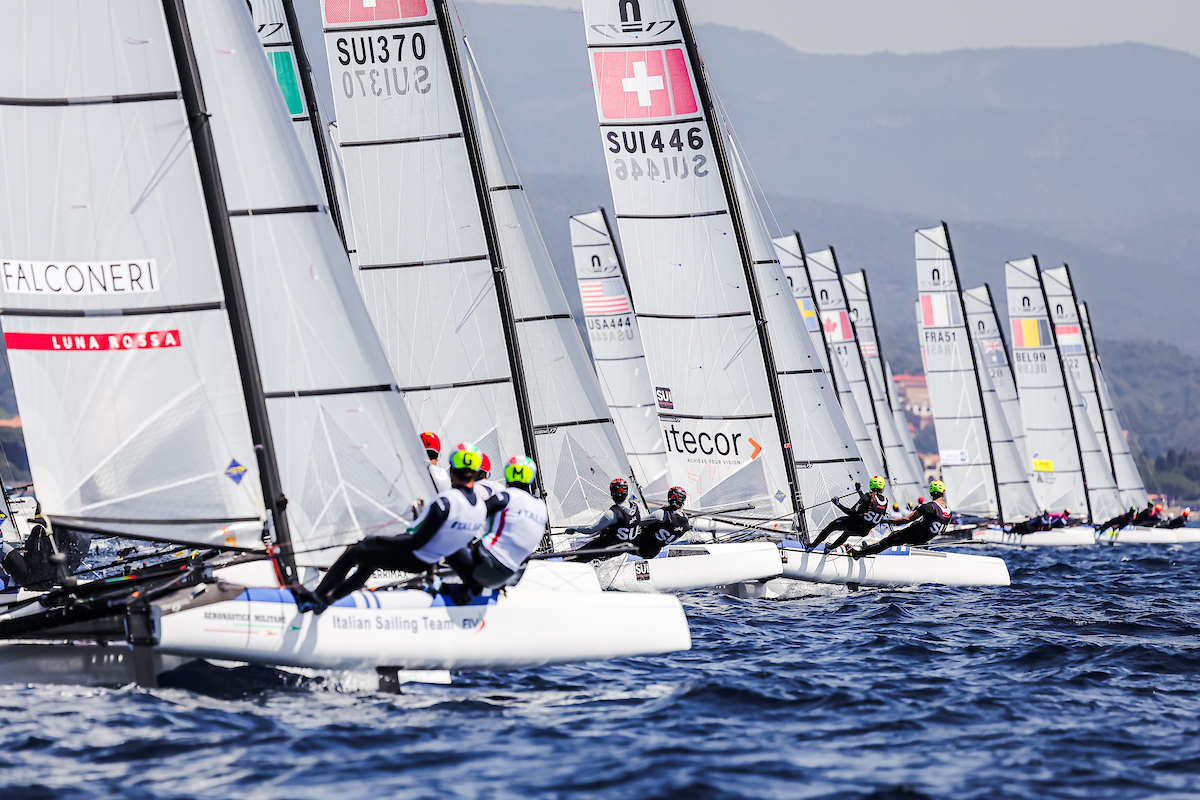 The 49er fleet, with 45 teams, reflects that same intensity, and nowhere more so than within the Chinese squad. Xin Wang and Tianyu Qi, who finished third in Palma, remain firmly in contention, while their teammates Zaiding Wen and Tian Liu, the Paris 2024 Olympians, are also well placed in eighth overall, keeping the internal battle wide open. At the top of the fleet, the Americans Andrew Mollerus and Trevor Bornarth lead, just ahead of Ireland’s Robert Dickson and Sean Waddilove, who look to have found their form again after a few inconsistent regattas since Paris. New Zealand’s Sam Bacon and Blake McGlashan sit third heading into the gold fleet. Two victories in the first two races in yellow fleet saw Italy’s Lorenzo Pezzilli & Circolo Velico Ravennate Tobia Torroni jump into contention in a compressed leaderboard. Further down, the fight for the final gold fleet spot went right to the wire, with Otto Henry and Shaun Connor sneaking into 20th place and the last gold fleet spot by a single point ahead of New Zealand’s Francesco Kayrouz and Hamish McLaren. With the reset now in effect, the next three days of elimination racing will decide who makes the top 10 and the medal series, and with stronger breeze forecast, the stakes are only getting higher.